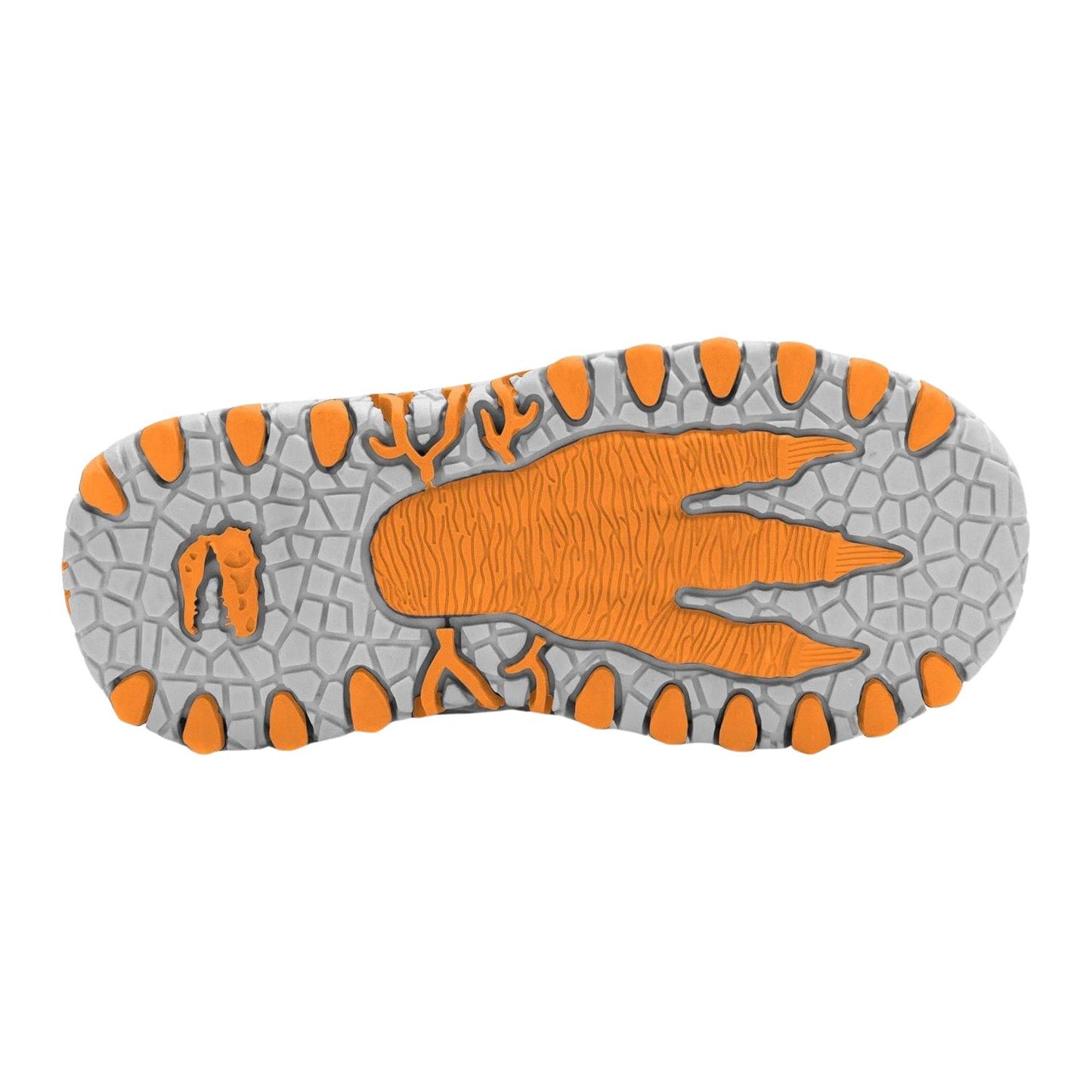 Roar into summer with T-Rex style and comfort wearing the T-Rex sandals by Bull Boys. Sandals come in a navy blue mesh upper and have a large orange T-Rex on the outer side of the sandals. The eye of the dinosaur lights up as you stomp making you feel invincible! Cut out side and heel sections allows the foot to breathe on hot days. Hook and loop fastening with Bull Boys branding make for easy on/off. Contrasting orange claw print sole unit completes the look