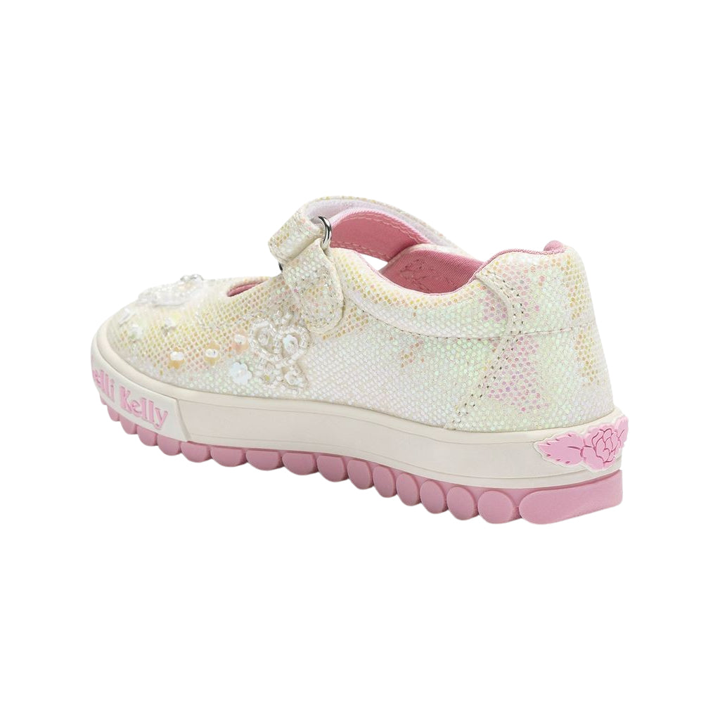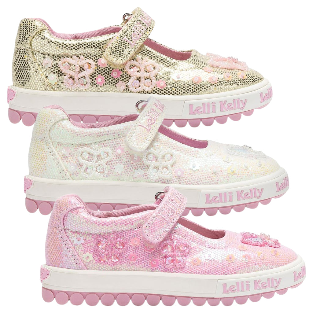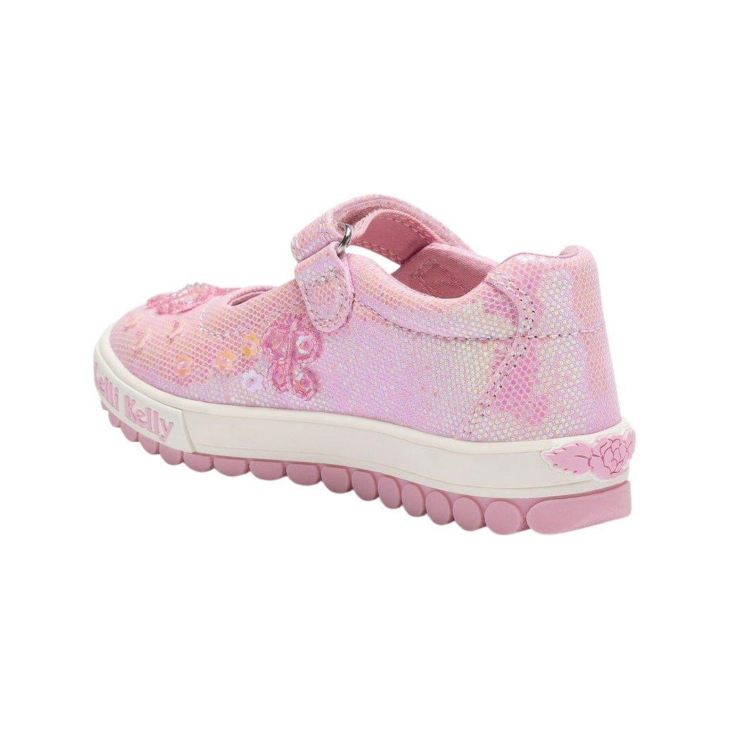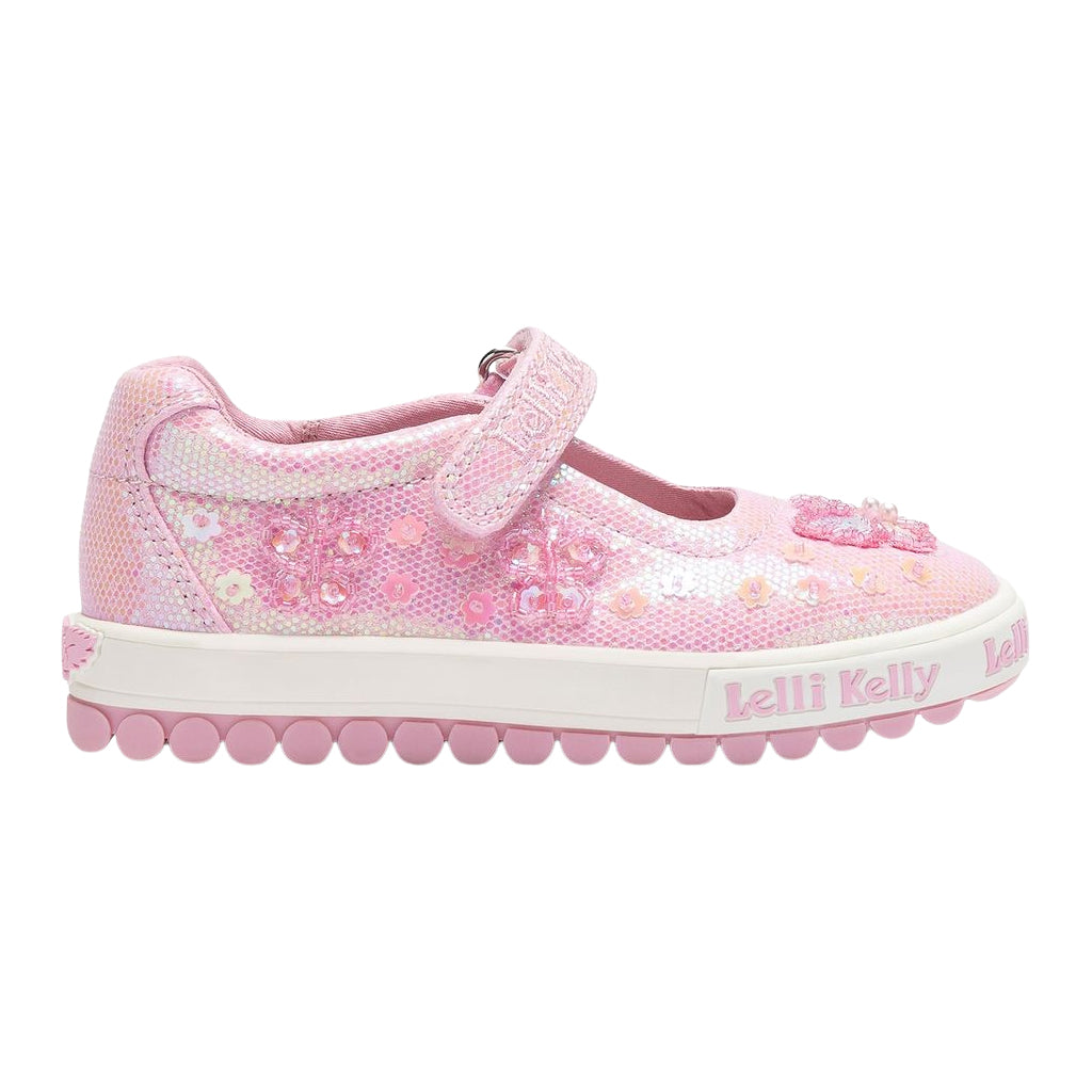 Step into a world of shimmer and sunshine with this gorgeous pink glitter Mary Jane from Lelli Kelly. The upper twinkles with every move, catching the light beautifully thanks to its dazzling glitter finish. Delicate beaded butterflies flutter across the shoe, while pink sequin flowers add an extra touch of charm - creating a magical garden right at her feet. The adjustable strap fastening ensures a snug, comfortable fit, complete with embroidered Lelli Kelly branding for that iconic finishing touch. The new roly sole unit brings bounce and flexibility to every step, while the moisture-wicking insole helps keep little feet fresh, comfy, and ready for fun. Inside, a pale pink canvas lining completes the look.