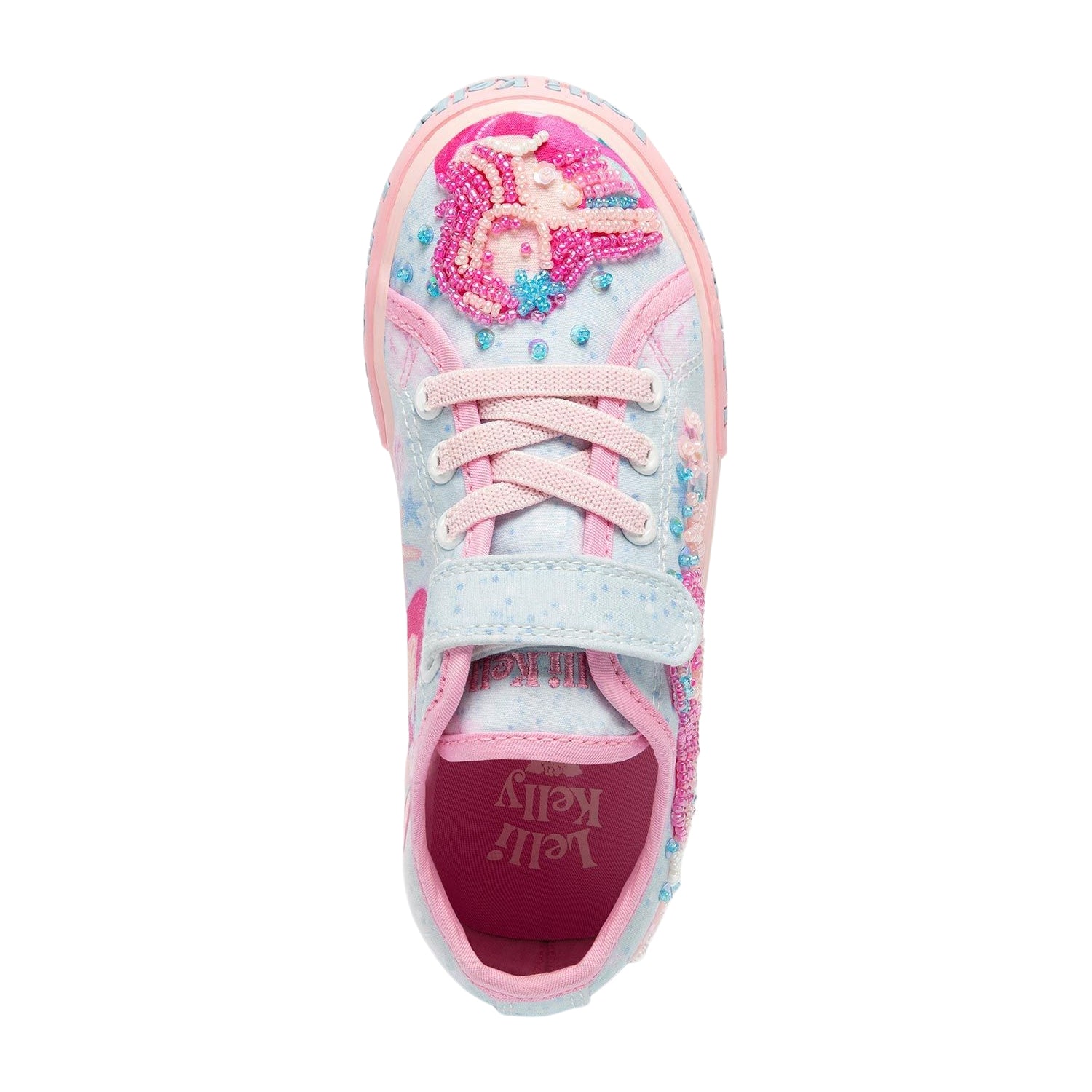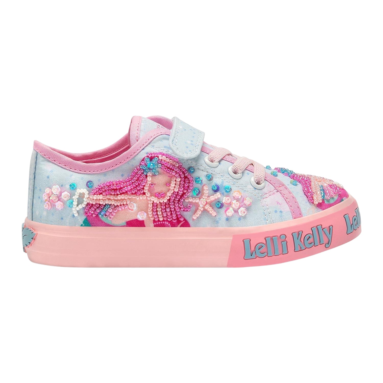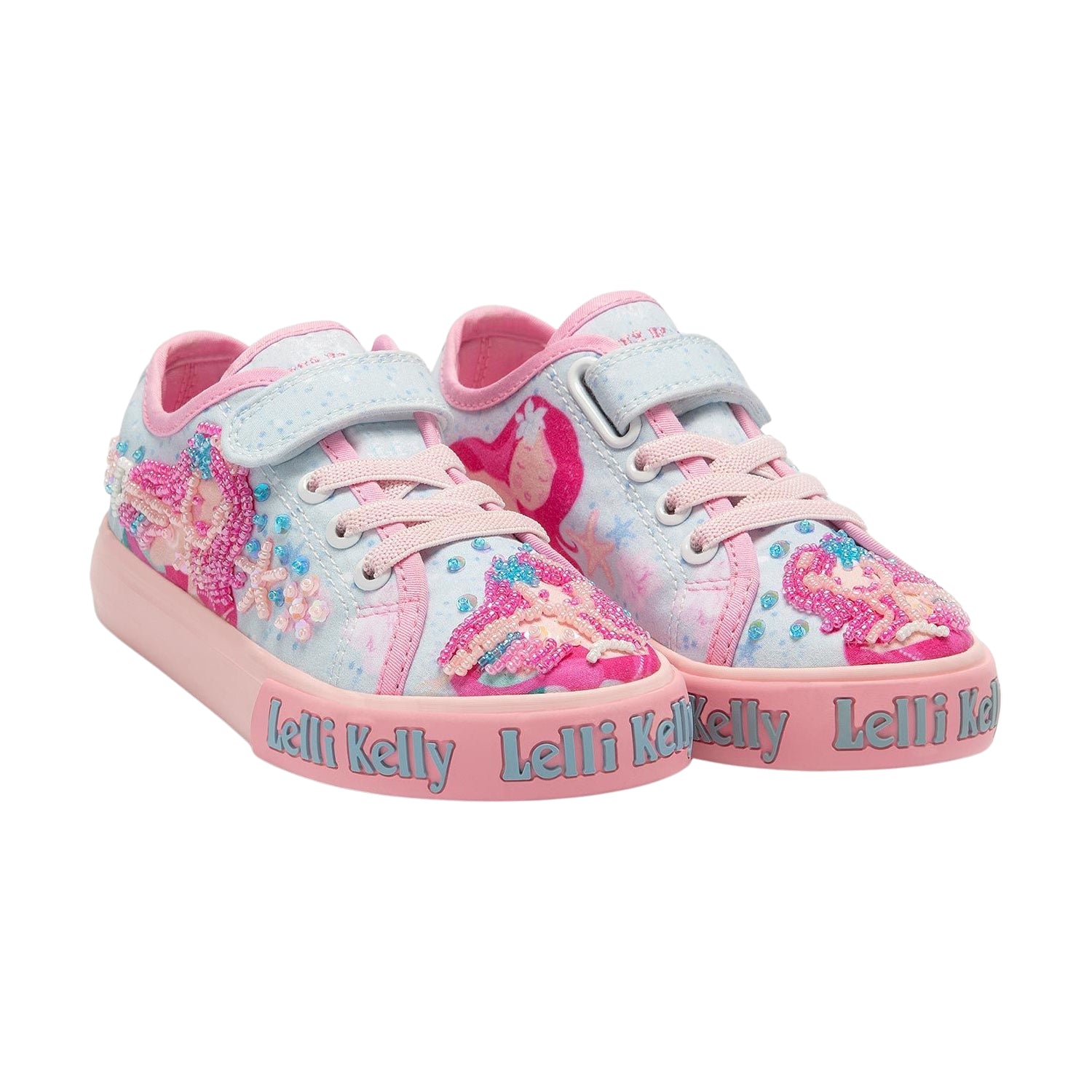 Step into the mesmerising world of mermaids wearing the Sirenetta Low canvas by Lelli Kelly. Pale blue canvas uppers have a series of beaded mermaids and star fish. A series of smaller sequins are scattered between, adding that extra touch of sparkle you come to expect from Lelli Kelly shoes. Moisture wicking removable insole helps keep little feet fresh. Pink sole unit with Lelli Kelly branding completes the look.