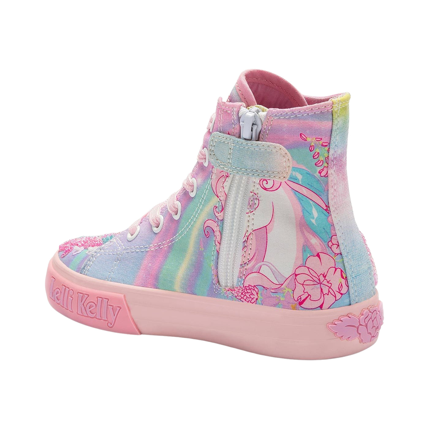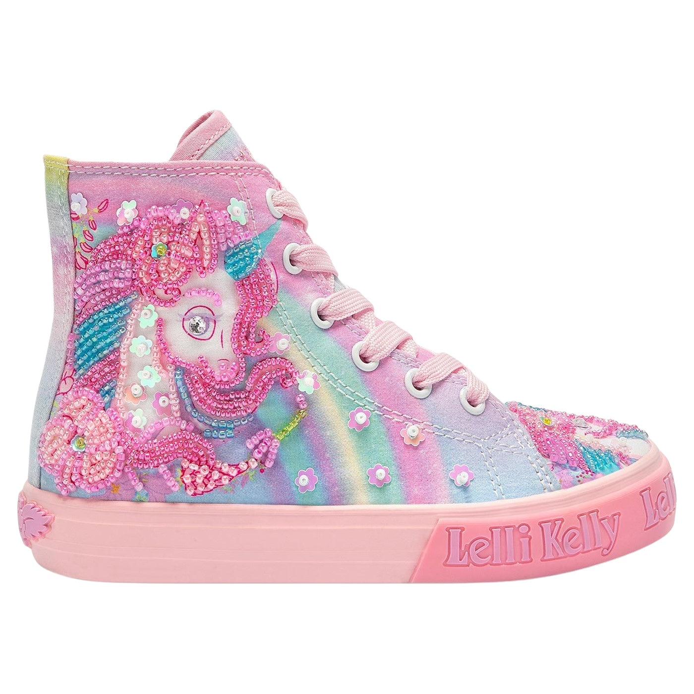 Meet the latest edition to the Unicorn Collection from Lelli Kelly. Unicorn Mid Boots come in a multi coloured canvas, decorated with a large, beaded unicorn on the side and on the front uppers. Scattered pearlescent sequins flowers also decorate the uppers adding that extra detailing that you come to expect from Lelli Kelly. Pink sole unit is embossed with Lelli Kelly wording. Choice of lace fastening, or you can use the side zip fastening for a quick easy on/off. Whilst moisture wicking removable insoles, helps keep those little feet fresh.