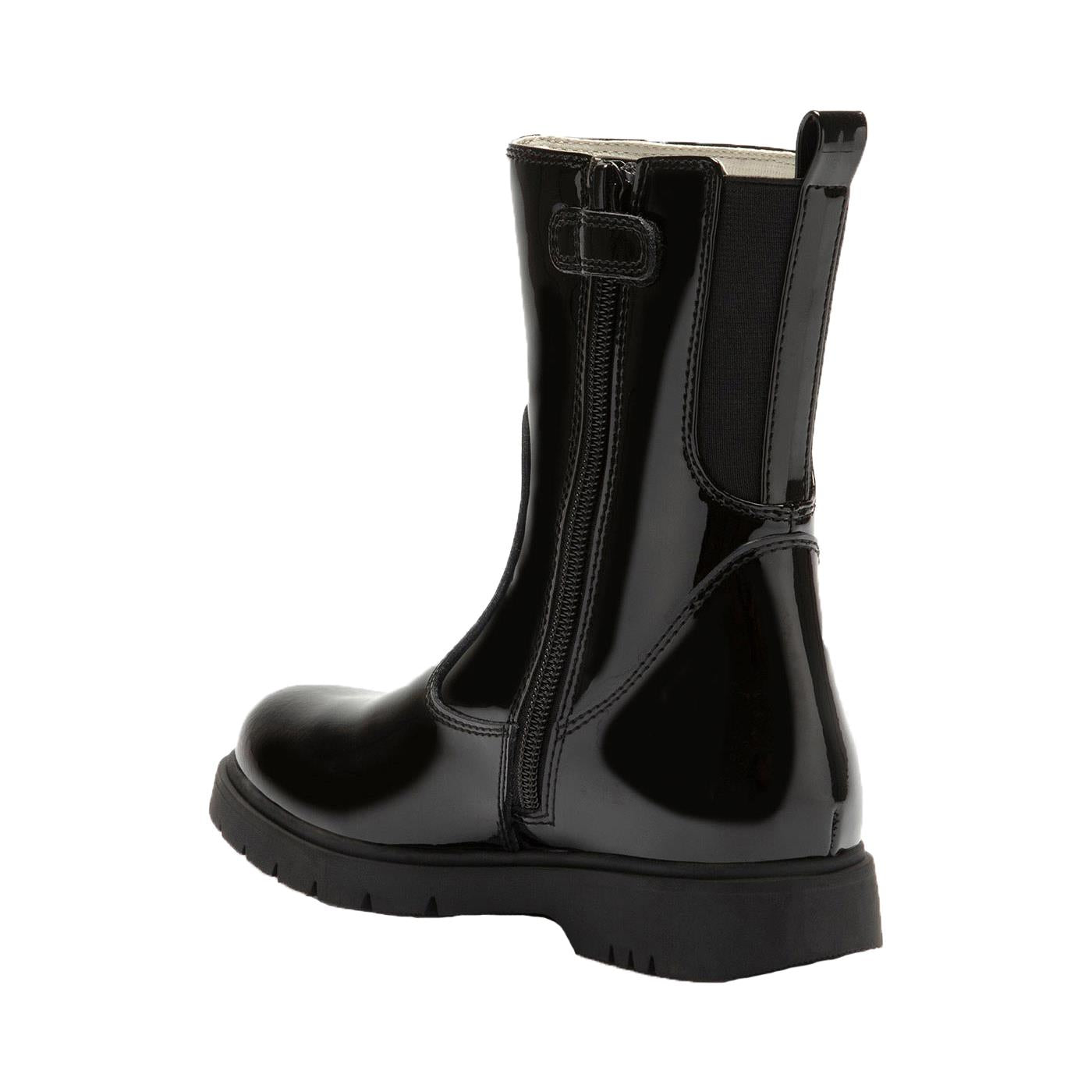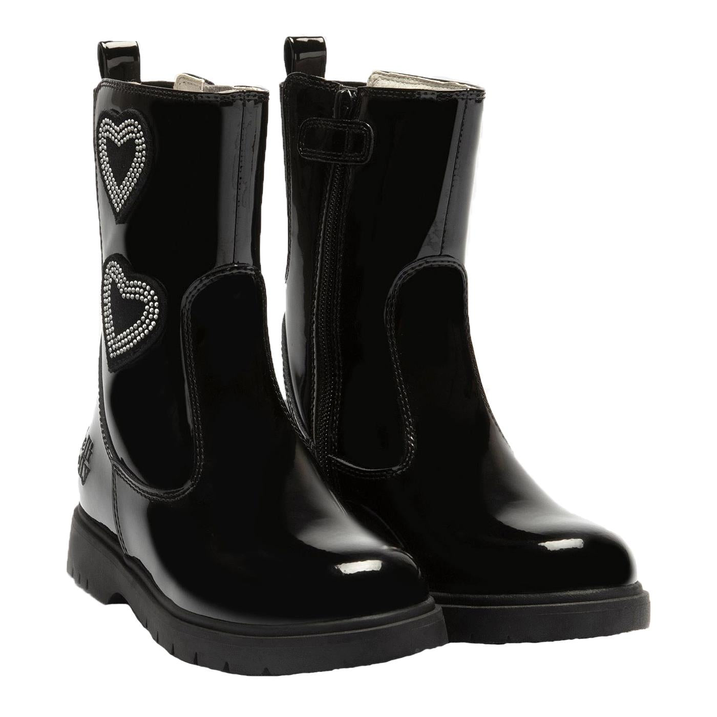 Step out in style wearing the Valeria M mid-calf boots. Black patent uppers with two decorative diamante hearts on the leg of the boot. Elasticated gusset sections run up the rear of the boots. Side zip fastening for easy on/off. Leather and textile lined. Black sole unit completes the look