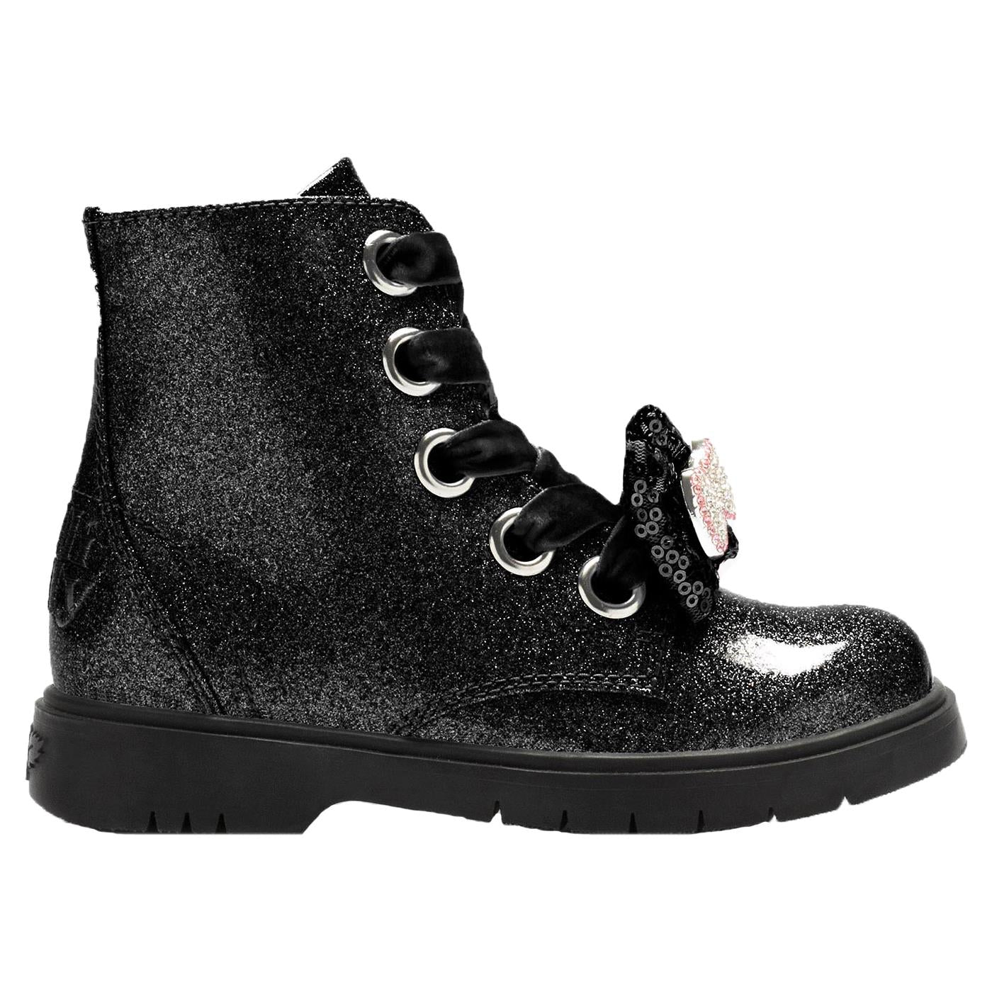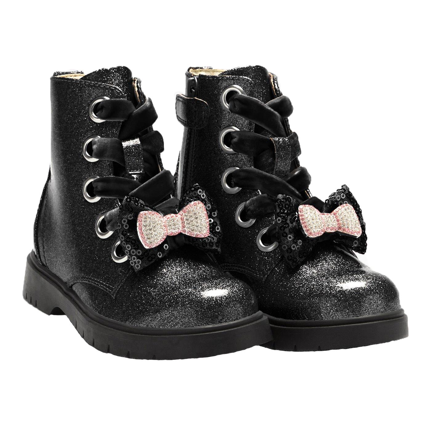 Sparkle with every step wearing the Fior Di Fiocco black glitter shimmer boots. Black sparkly uppers with a choice of velvet laces or cotton black laces. Side zip fastening for easy on/off. A large sequin bow sits on the front with a silver/pink diamante bow in the centre. Black sole unit completes the look