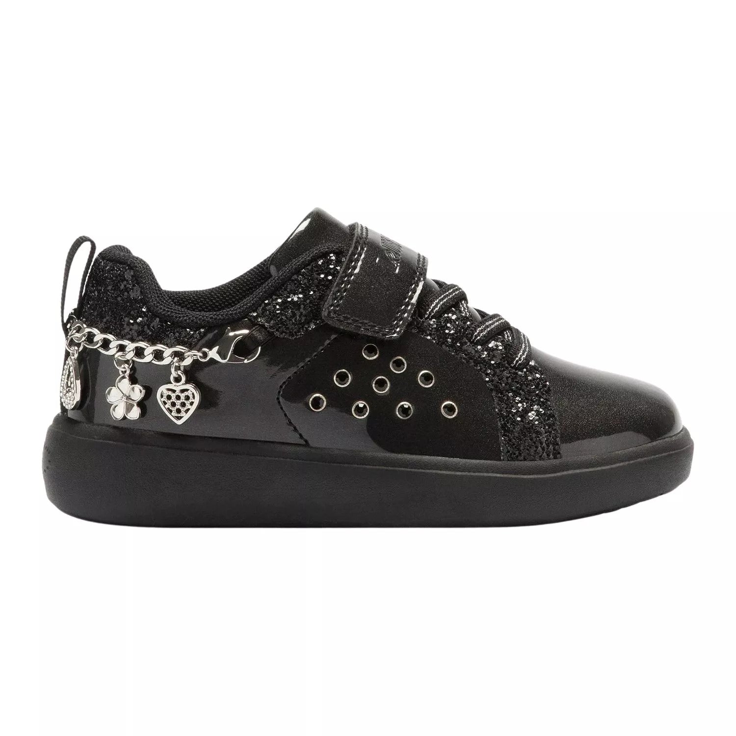 Stand out from the crowd wearing the Gioiello trainers. Gioiello comes in a patent metallic shiny upper with a black glitter trim. Large gemstones sit on the outer side of the shoes, making them sparkle with every step you take. Elastic laces with hook & loop fastening for easy on/off. Trainers have a removable silver charm bracelet. Black sole unit completes the look.