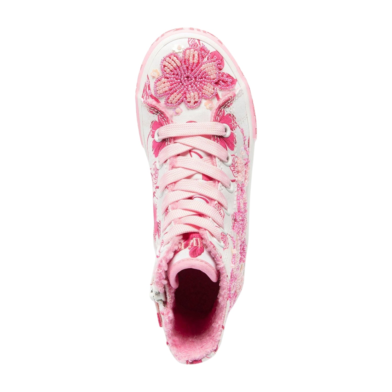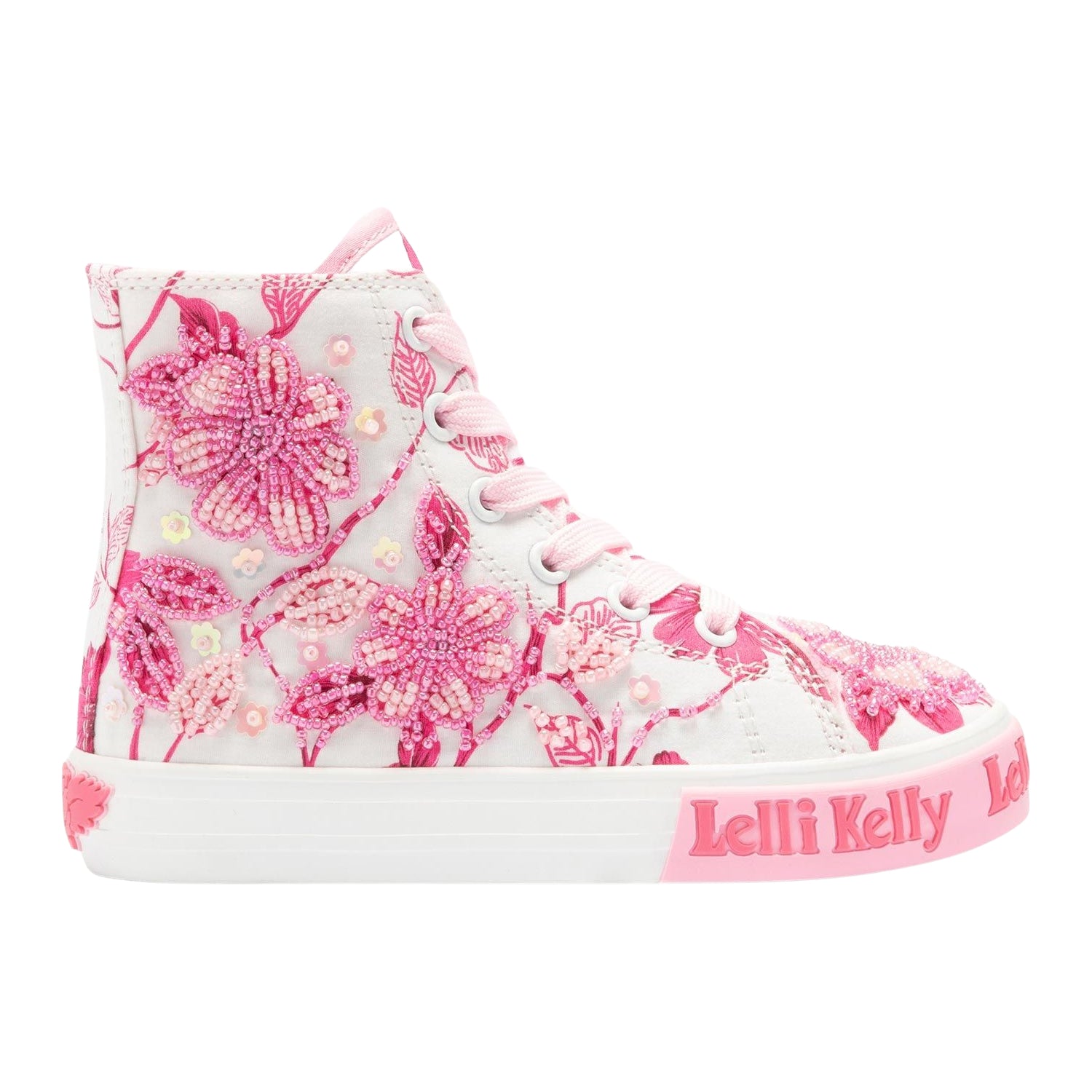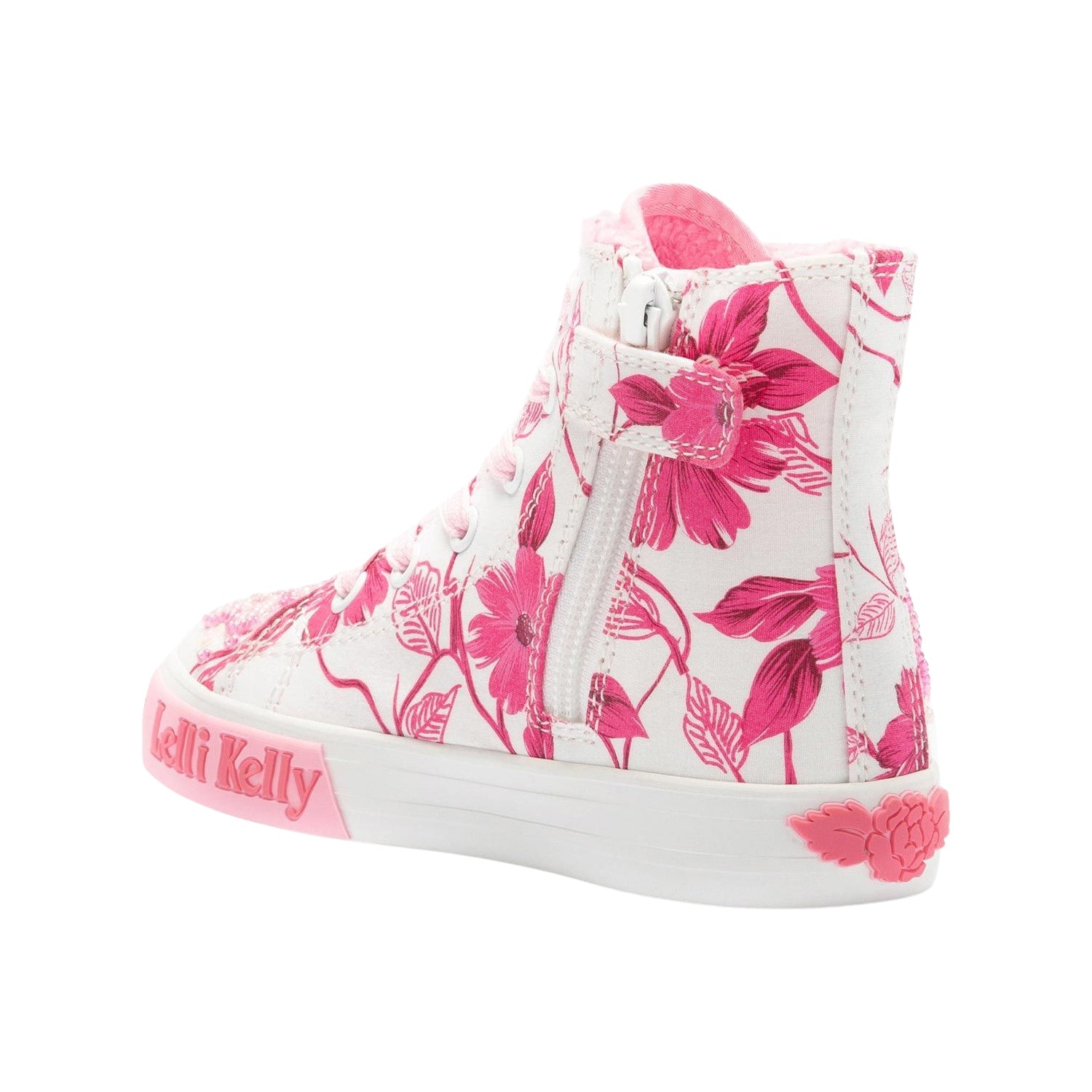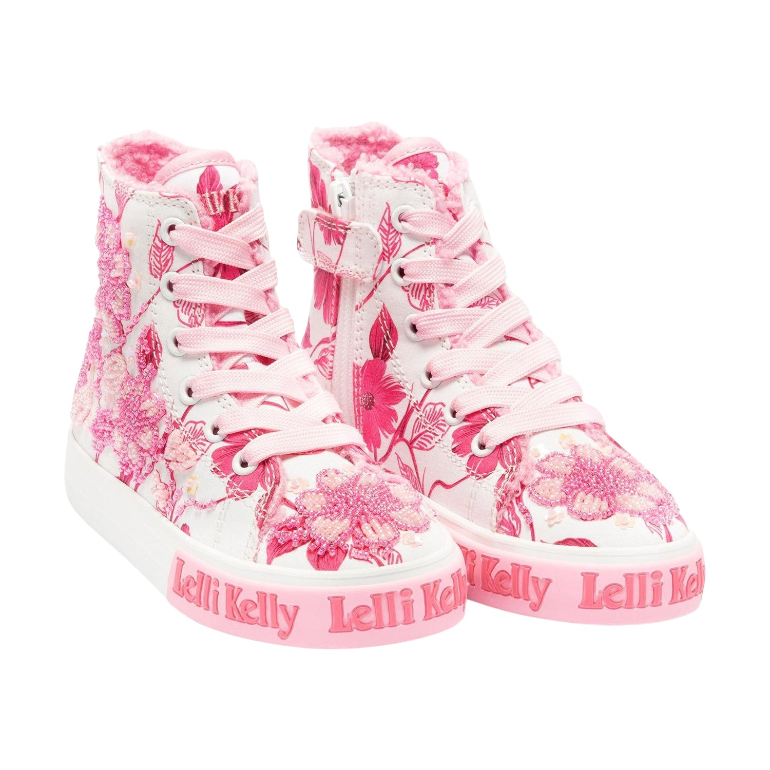 Brooke Mid Baseball Boots with a warm lining allow you to continue wearing your favourite style even when it’s cold outside. White canvas uppers are decorated with pink tonal beaded flowers. Side zip or lace fastening makes them a better fit. Lelli Kelly is embroidered in pink onto the tongue. Pink sole is embossed with Lelli Kelly wording round the front of the sole unit. Warm lined faux shearling provides warmth on colder days and completes the look.