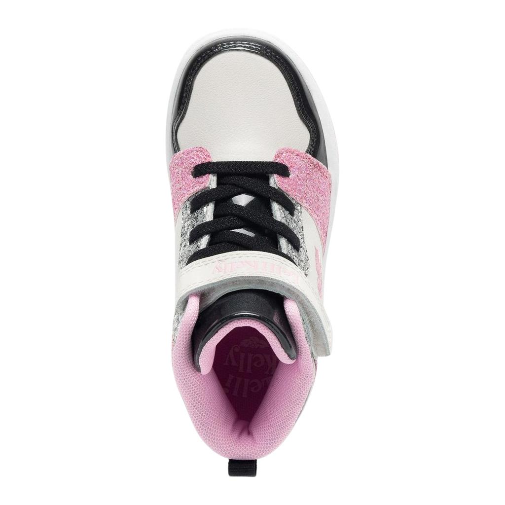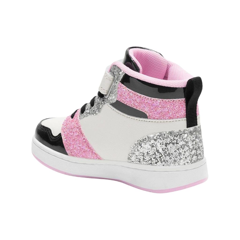 Due to the demand for this product Gaia high top ankle boots are back for another season! White uppers have a contrasting black patent trim and pink and silver glitter trim and heel counter. Lelli Kelly embroidered logo takes pride of place on the outside of the boots. Boots have easy on/off system thanks to the elastic laces and hook and loop fastening. Pink textile lining and white/pink sole unit completes the look.