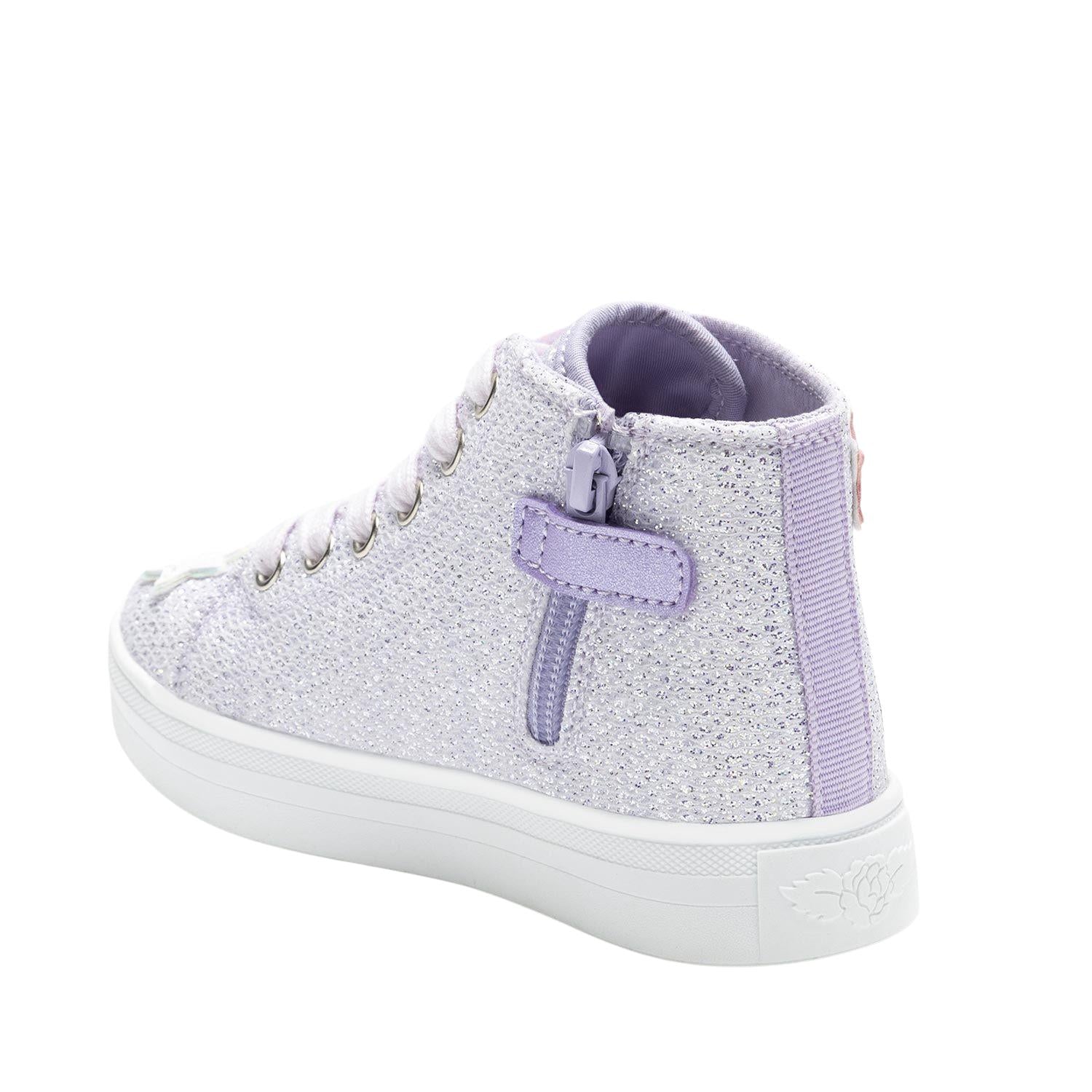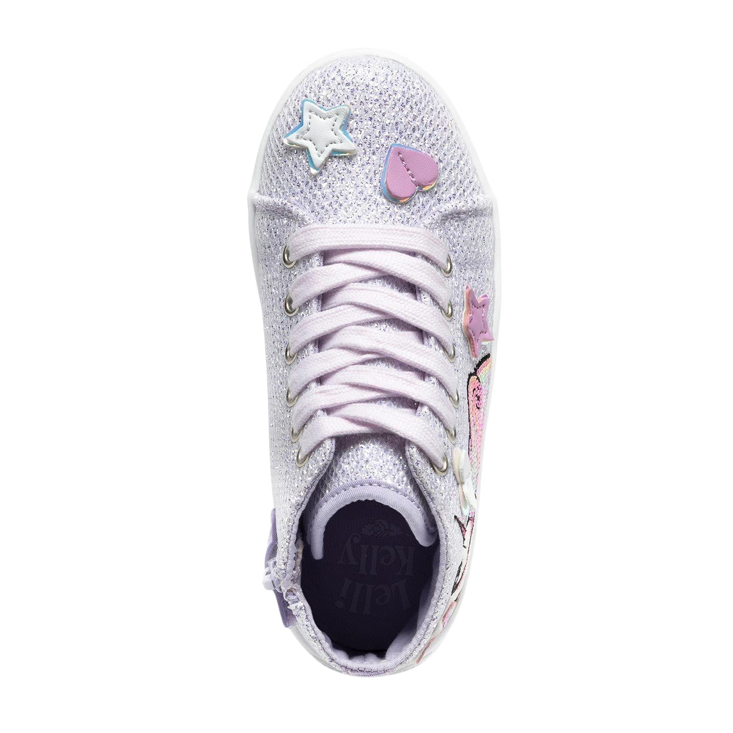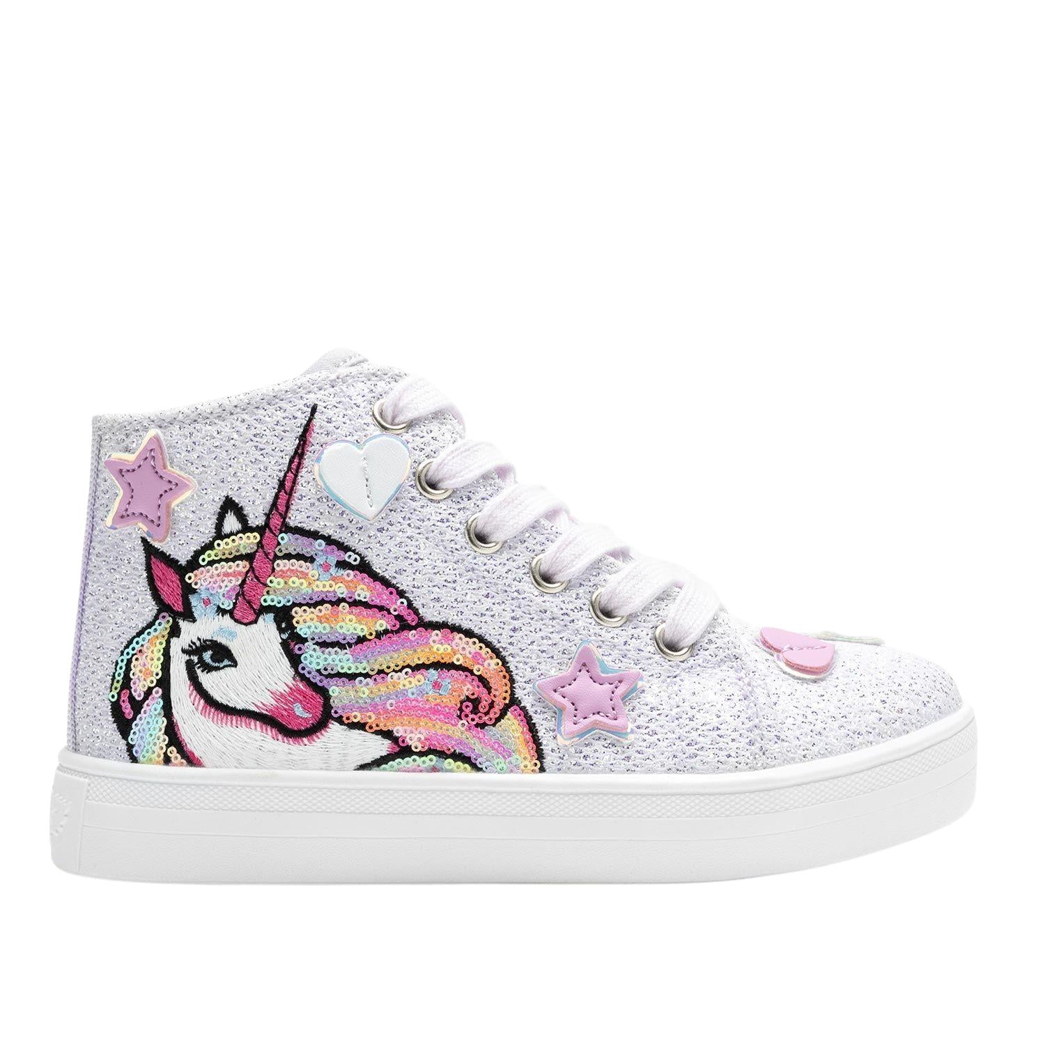 Step into a magical world of Unicorns whilst wearing the Vttoria Baseball Boots. Boots come in a shimmering Lilac upper decorated with a beautifully stitched unicorn and a multi colour sequined mane, scattered stars and hearts add to the magic. Lilac laces or why not use the side zip for easy on/off fastening. Lilac lined with a White sole unit is embossed with the Lelli Kelly branding.