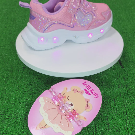 Lelli Kelly Sabina trainers add that touch of fun to your feet. Sabina trainers light up as you stomp. Glittery uppers with a light up white sole unit. Heart glitter pattern on the outside of the shoes. Elastic laces with hook and look fastening ensure quick and easy on/off.